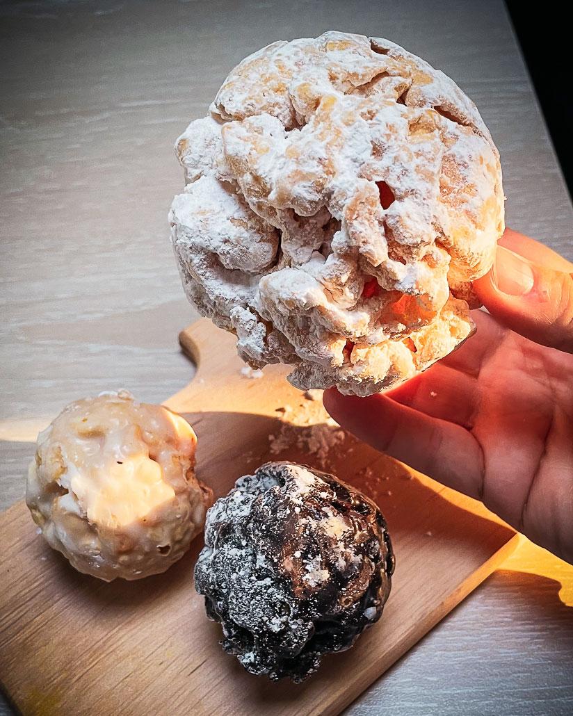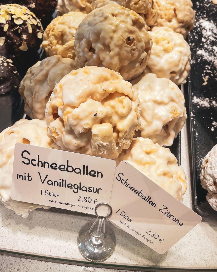 The snowball is made of shortcrust pastry dusted with icing sugar. But there are also variations with chocolate, lemon icing, white chocolate and a few more. At the Stiffler bakery, you can watch the pastry chef making the snowballs in the glass production area.