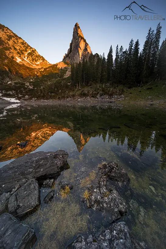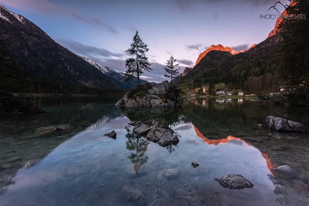 On the northern shore of the mountain lake are two huge rocks in the crystal-clear water. But that's not all: trees also grow on the rocks. When there is no wind, the rocks and trees are reflected in the lake. With the mountain scenery in the background, this motif is unforgettable. By the way, here you will find the most beautiful photo motifs in Berchtesgadener Land.