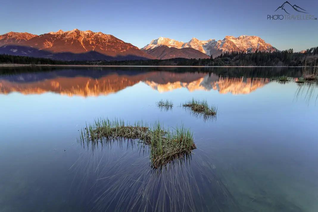 Lake Eibsee - the "Bavarian Caribbean The Zugspitze in the light of the setting sun. Lake Eibsee is definitely one of the most beautiful mountain lakes in Bavaria. By the way, you can also swim in the Eibsee in summer.